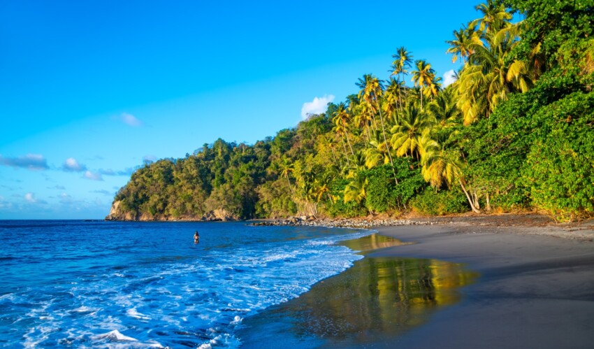 Située à l’extrême nord de la Martinique, au pied de la Montagne Pelée, l’ Anse Couleuvre et son sable noir volcanique est sans doute l’une des plus belles plages sauvages de la Martinique.