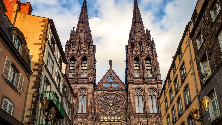 La majestueuse cathédrale gothique s’élève vers le ciel et couronne la colline du centre historique de Clermont. Sa construction a débuté en 1248, sous la direction de l’architecte Jean Deschamps et sous l’épiscopat d’Hugues de la Tour.
