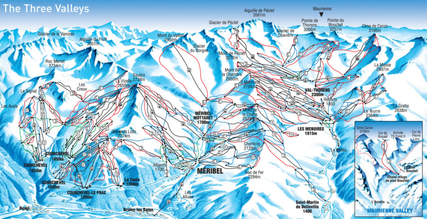 Courchevel est le plus grand domaine skiable du monde, au sein des 3 Vallées : il comprend 600 km de pistes, dont 180 pistes vertes-bleues et plus de 140 pistes rouges-noires.