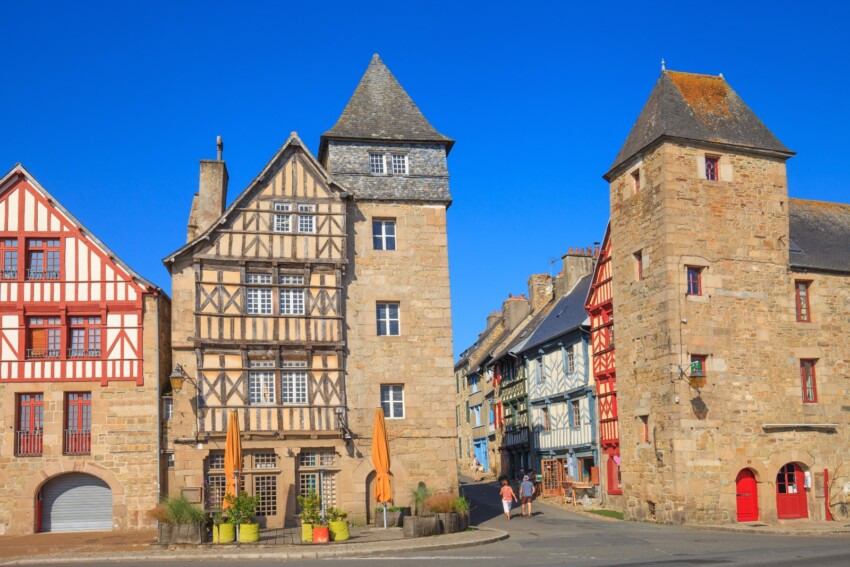 Ici, le temps semble s’être arrêté au Moyen-Âge : forêts luxuriantes entourant le village, jardins fleuris des vieilles maisons de granit, belles enseignes en fer forgé signalant les métiers d’art, le silence est ici roi, contrastant avec l’histoire mouvementée de cette formidable place forte du Penthièvre qui a dû faire face à de nombreuses attaques.