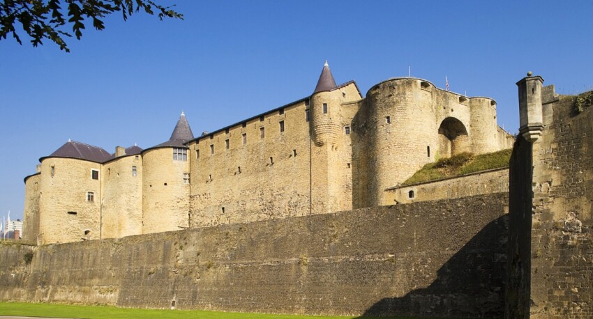 Le château fort de Sedan se dresse sur un promontoire au bord de la Meuse, autrefois flanquée de deux ruisseaux, la Bièvre et la Vra. Construit en 1424 par Evrard de La Marck, c’est la plus grande forteresse médiévale d’Europe avec une superficie de 35 000 m2, répartie sur sept niveaux et des murs de plus de 7 mètres de large.