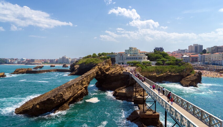 C’est précisément la douceur de son climat qui a fait le succès de la ville dans la seconde moitié du XIXe siècle, lorsque Napoléon III et l’impératrice Eugénie en ont fait leur lieu de villégiature favori. Depuis, la ville est devenue l’emblème du tourisme chic et le paradis des surfeurs du monde entier, grâce aux grandes vagues qui viennent s’écraser sur ses plages.