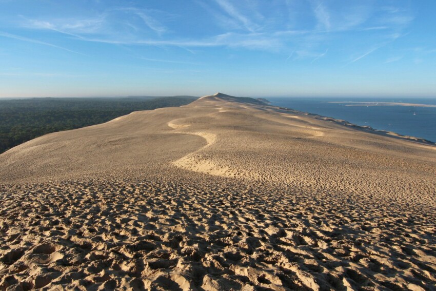 La dune est immense, avec du sable à perte de vue. N’hésitez pas à vous éloigner le plus possible de l’accès au sommet pour profiter de la tranquillité du lieu. Laissez votre regard se promener: à l’est, du côté où vous avez fait l’ascension, vous verrez une interminable forêt de pins maritimes, la plus grande forêt artificielle d’Europe. De l’autre côté, à l’ouest de la dune, où la pente est beaucoup plus douce, l’océan, le Banc d’Arguin et la pointe du Cap Ferret. Enfin, au nord, le bassin et Arcachon.