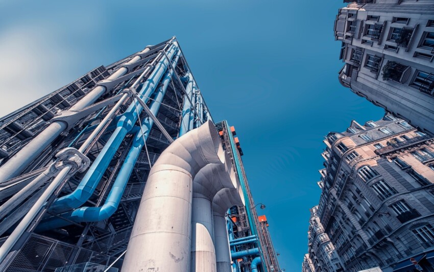Recognisable from a distance by its unusual and bizarre aesthetics, the building was conceived as a kind of giant machine, showing its internal skeleton, instead of hiding it: in fact, the building highlights the load-bearing structure, the main escalators, the ducts for the systems which, brought outward like a kind of coat, are emphasised by the bright colours and become the main aesthetic elements of the building. Même le choix des couleurs n’est pas aléatoire. En effet, chaque teinte distingue un contenu différent des tuyaux : le bleu a été utilisé pour l’air, le vert pour les liquides, le jaune pour les câbles électriques et le rouge pour les voies de communication.