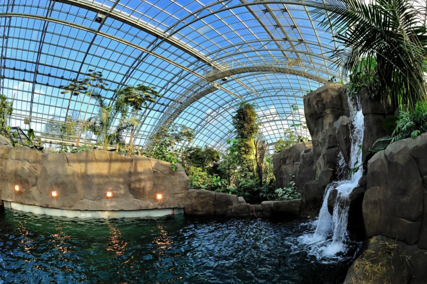 Une serre monumentale vous plonge dans la forêt tropicale. Près d’une cascade poussent de grands ficus sur lesquels sont accrochées des lianes et des plantes tropicales. De petits primates, des sakis à face blanche et des tamarins s’ébattent dans les branches.