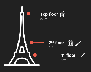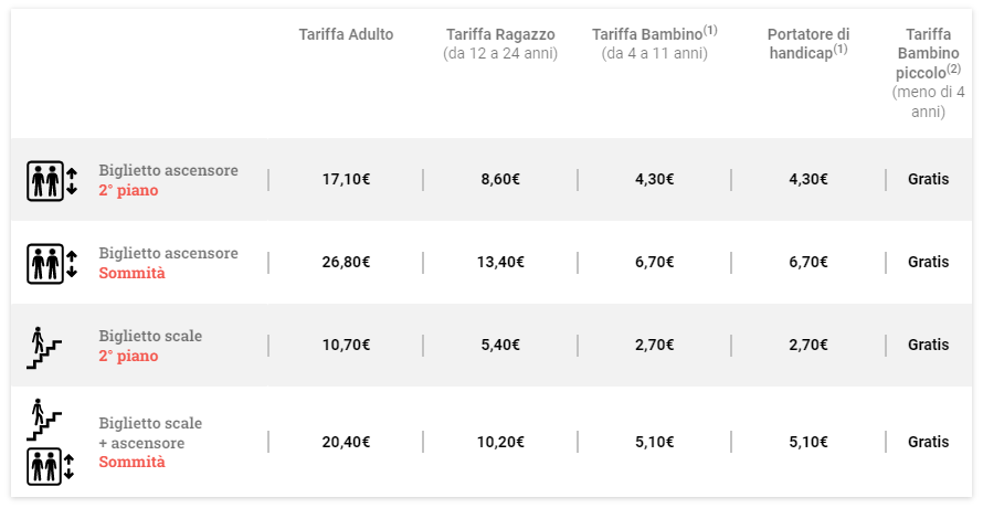Le billet le moins cher est bien sûr celui qui ne comprend que la montée à pied au 2e étage, tandis que le plus cher est celui qui comprend toute la montée en ascenseur jusqu’au sommet.